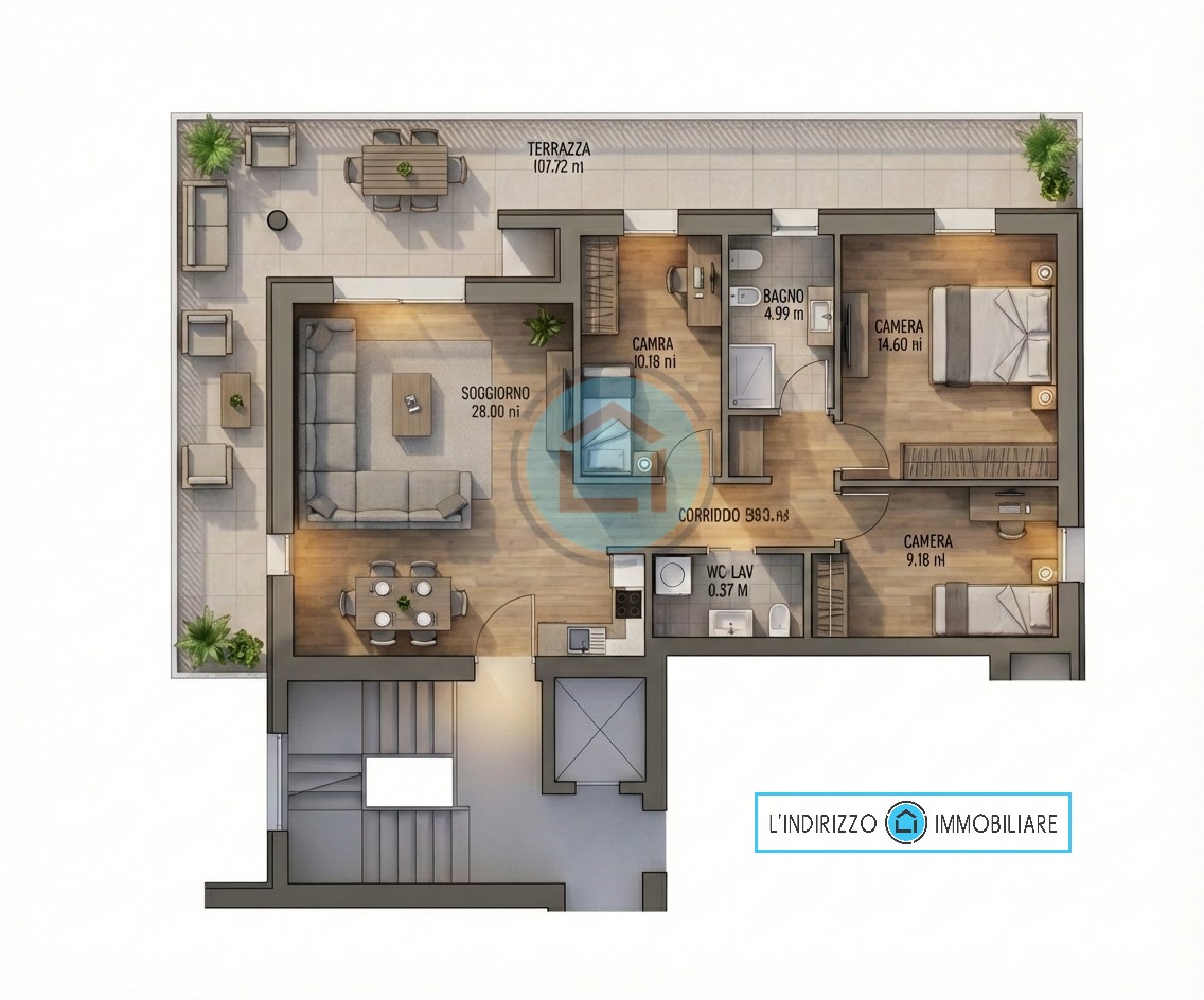 L’immobile si trova al secondo ed ultimo piano ed è ideale per chi desidera un’abitazione pronta da vivere con uno spazio esterno davvero introvabile: una terrazza abitabile di 35 mq., disposta su due lati del condominio.